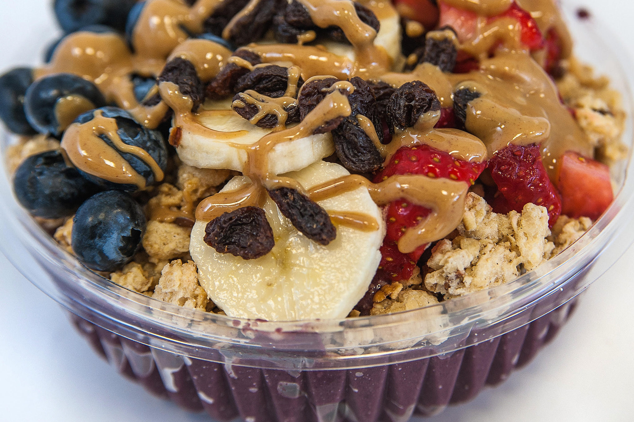 Organic Acai, strawberries, blueberries, bananas, chocolate almond milk and pb2 topped with strawberries, blueberries, bananas, organic blueberry flax granola, organic raisins and natural peanut butter