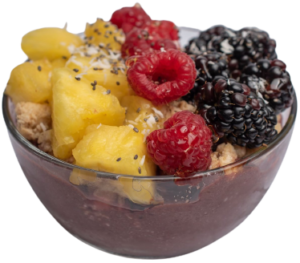 Organic Acai blend topped with blackberries, raspberries, pineapples, organic blueberry flax granola, chia seeds, organic coconut shreds and honey