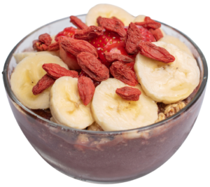 Organic Acai blend topped with bananas, strawberries, organic blueberry flax granola, organic goji berries and honey