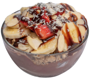 Organic Acai, cocoa, maca, almonds, almond milk, pineapple, bananas, strawberries topped with chocolate hazelnut granola, bananas, strawberries, sliced almonds, organic coconut shreds and chocolate drizzle