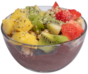 Organic Acai blend topped with strawberries, pineapples, kiwi, organic blueberry flax granola and hemp hearts