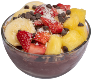 Organic Acai blend topped with pineapples, bananas, strawberries, organic blueberry flax granola, mini chocolate chips, organic coconut shreds and honey