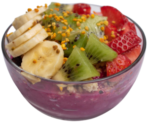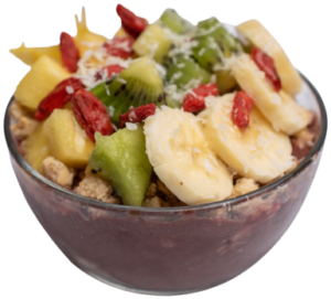 Organic Acai blend topped with kiwis, bananas, pineapples, organic blueberry flax granola, organic goji berries, organic coconut shreds, fresh lime and honey
