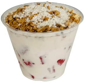 House made vegan cream poured over fresh strawberries and topped with cinnamon gluten free granola and organic coconut shreds
